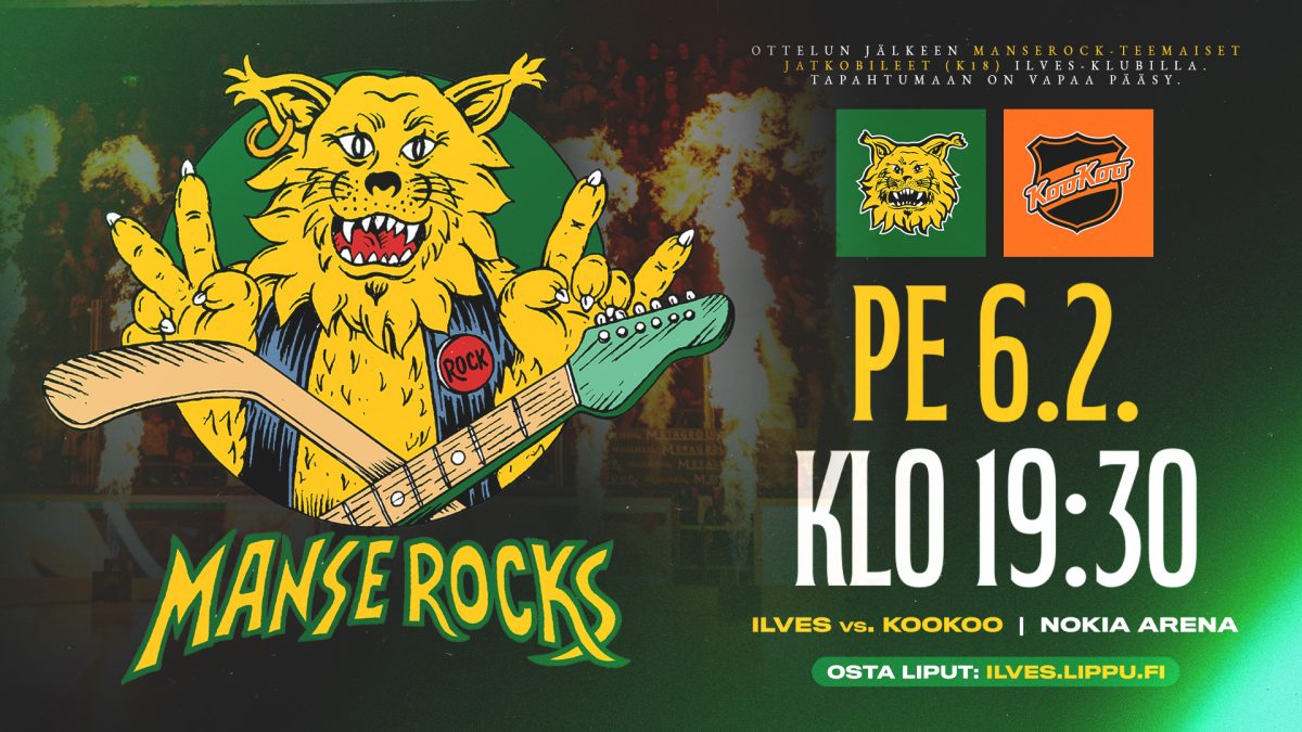 Perjantaina 6.2.2026 klo 19:30 käynnistyvä ottelu saa ympärilleen rock-henkistä asennetta niin jäällä kuin katsomossa. Tunnelmaan virittäydytään jo heti ovien auettua, kun Ilves Pregame -ohjelmaa täydentää Fredi Heinämäki Trio, joka herättää eloon Manserockin unohtumattomimpia klassikoita. Nokia Arenan aulassa pääset myös nappaamaan parhaat hetket talteen Muistox Photo Boothissa, joka tulostaa kuvat heti paikan päällä. Aulasta löydät lisäksi 1.8.2026 järjestettävän Manserock Stadionilla -tapahtuman städin, josta voit ostaa tarjoushintaisia lippuja elokuiseen rock-iltaan.