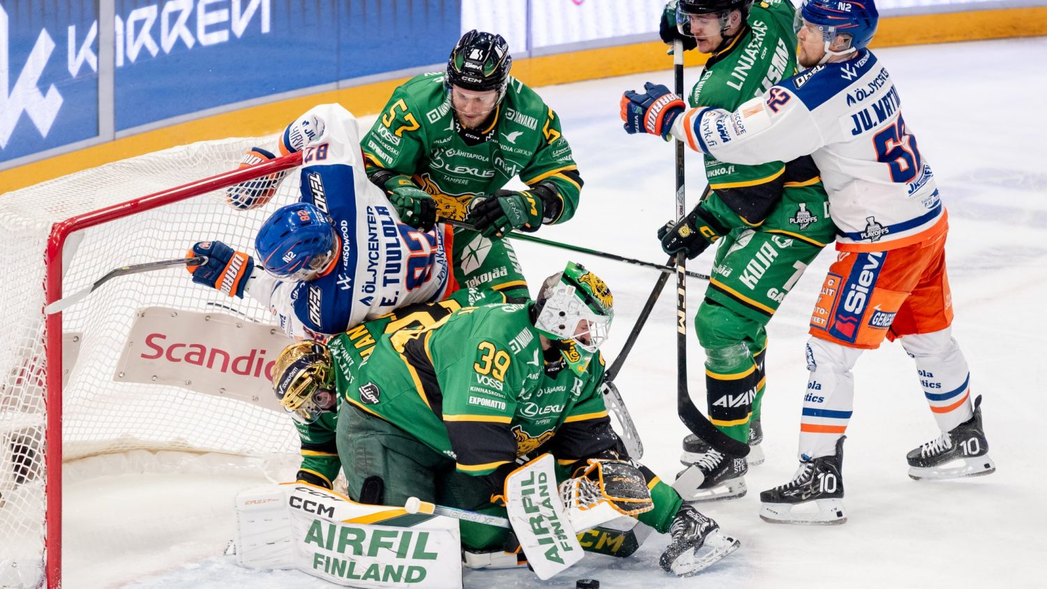 Erän viimeisellä minuutilla Tapparan Oiva Keskinen ja Kristian Tanus olivat juonia näyttävän osuman, mutta Dominik Pavlat piti lukemat tasoissa. Tappara kiri Ilveksen kolmen maalin johdon kiinni toisessa erässä, mikä takasi huimat asetelmat kolmanteen erään.